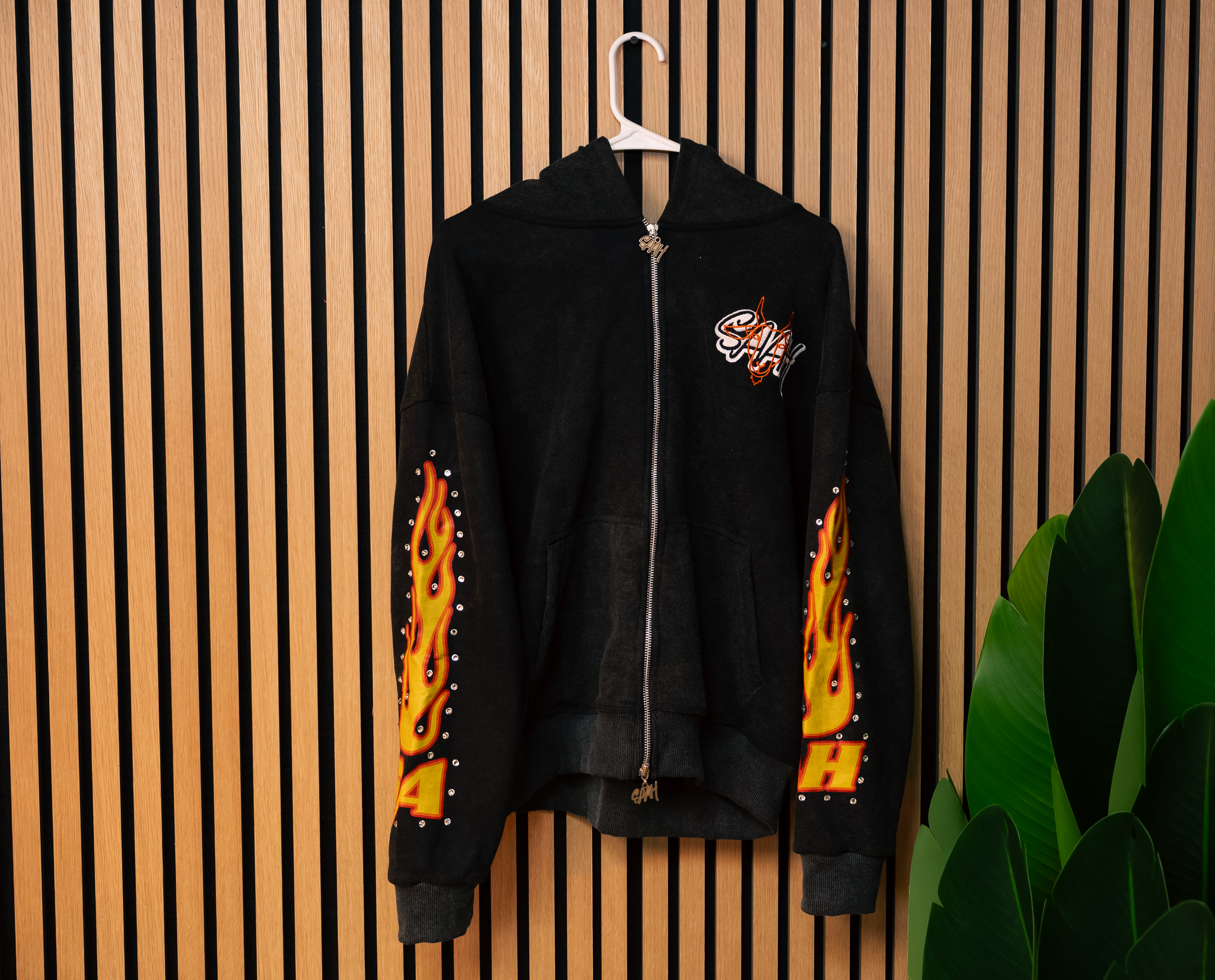 Make a bold statement with the SAAH “Success Is All About Habits” zip-up hoodie. Designed for both comfort and confidence, this piece features a custom SAAH metal zipper pull, rhinestone-accented flame graphics down each sleeve, and detailed embroidery on the front and back that brings your mindset to life.